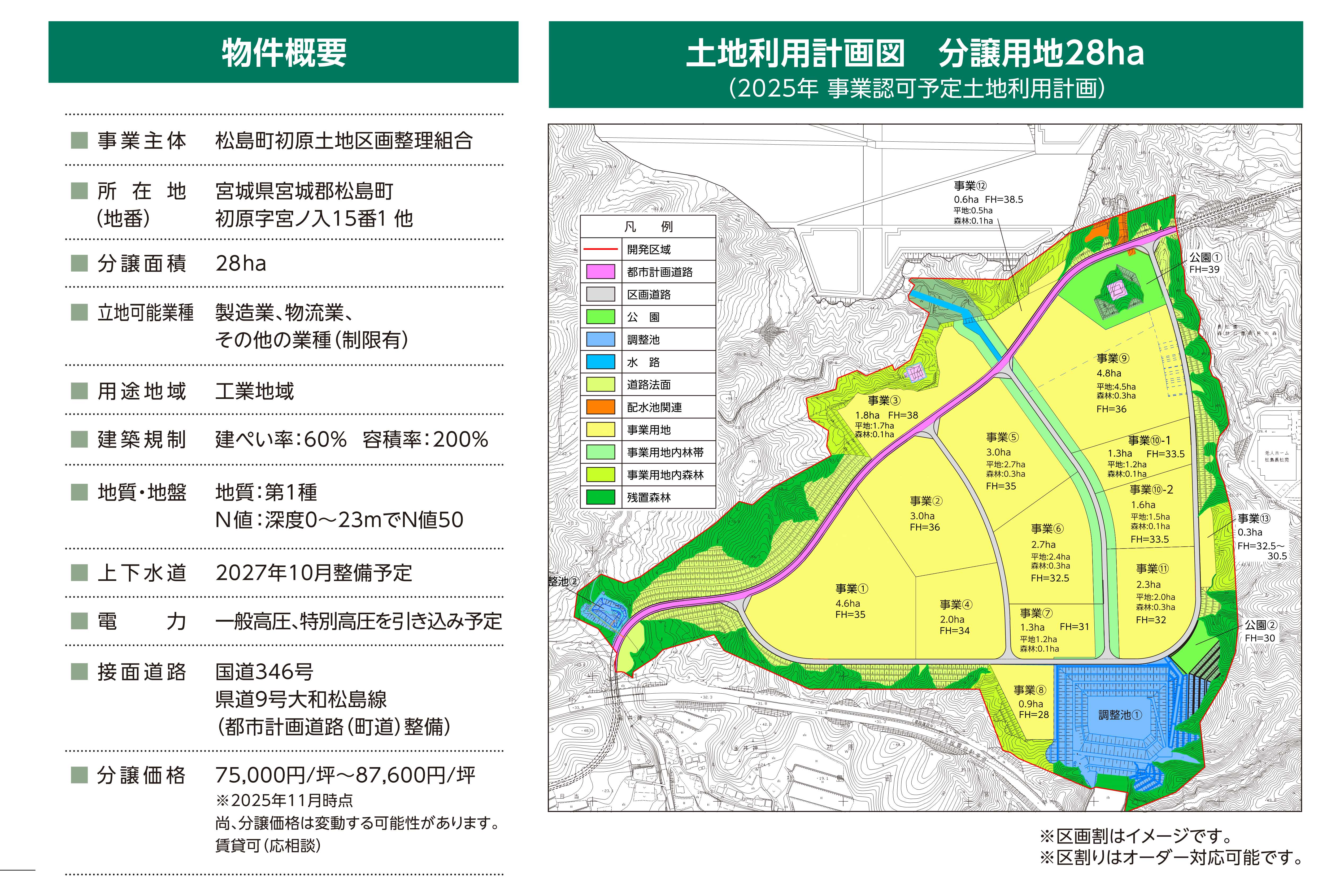 『松島イノベーションヒルズ 』の提供用地は約28ヘクタールの広さで、企業の皆様の立地計画に合わせたオーダーメイドによる用地の取得が可能です。