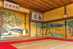 藩主等の賓客の間であり床の間、襖、障子腰板に金箔を張り付け、極彩色で画かれた桧と槙・笹竹等を中心に林木花卉と渓流の図は、構図法・彩色方から伊達家お抱の狩野派系統の絵師の遺品と見られている。 床の間の「雨奇晴好」の額は5代藩主吉村公の筆で宋の詩人蘇軾の詩から採った句である。 この亭を「観瀾亭」と命じたのは吉村公で廊下の額は江戸中期の書家佐々木玄龍の筆で次の間との欄間にかけてある「観瀾」の二文字は7代藩主重村公による。 |
